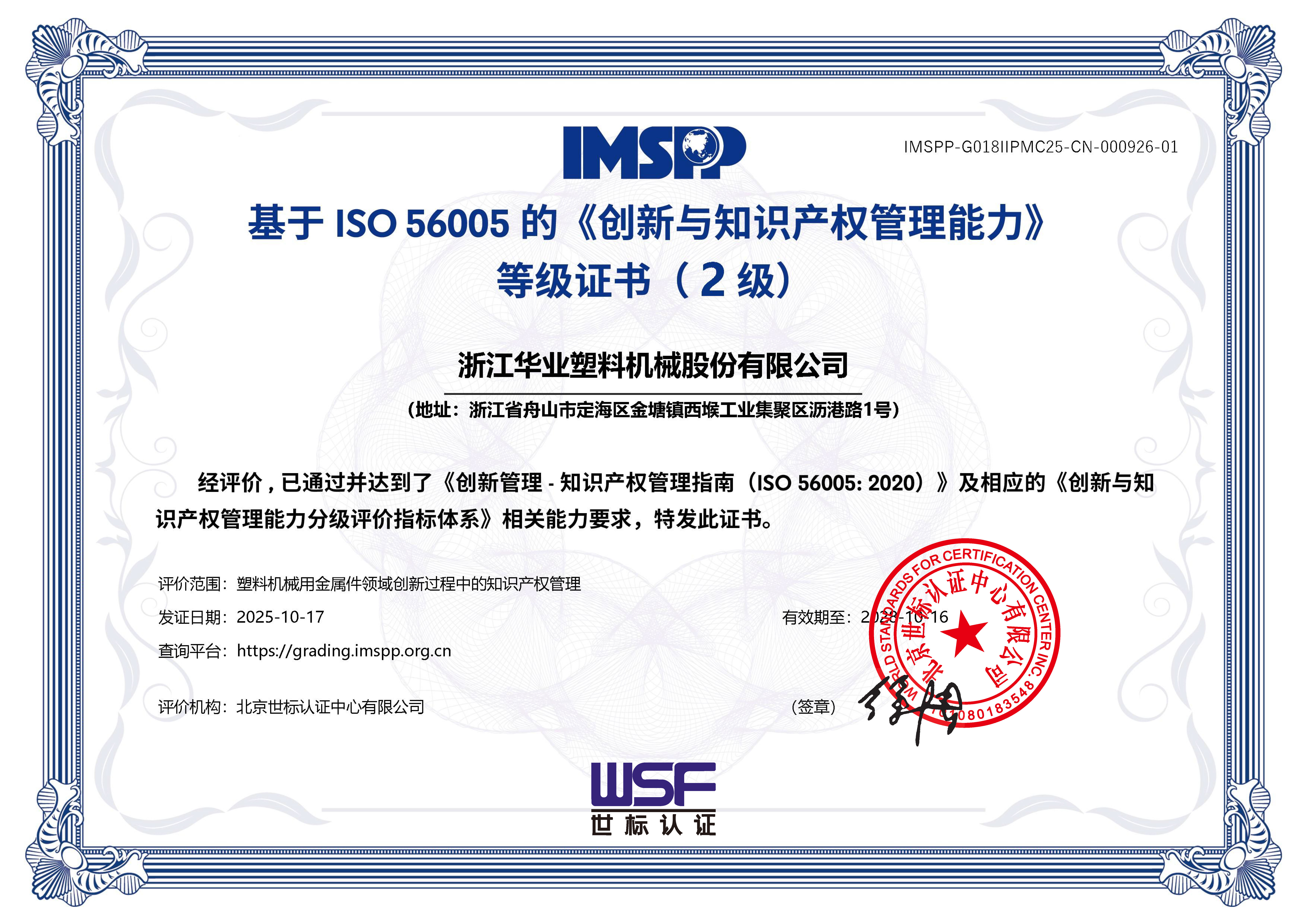 近日,浙江華業塑料機械股份有限公司(SZ.301616)榮獲ISO 56005的《創新與知識產權管理能力》等級證書…